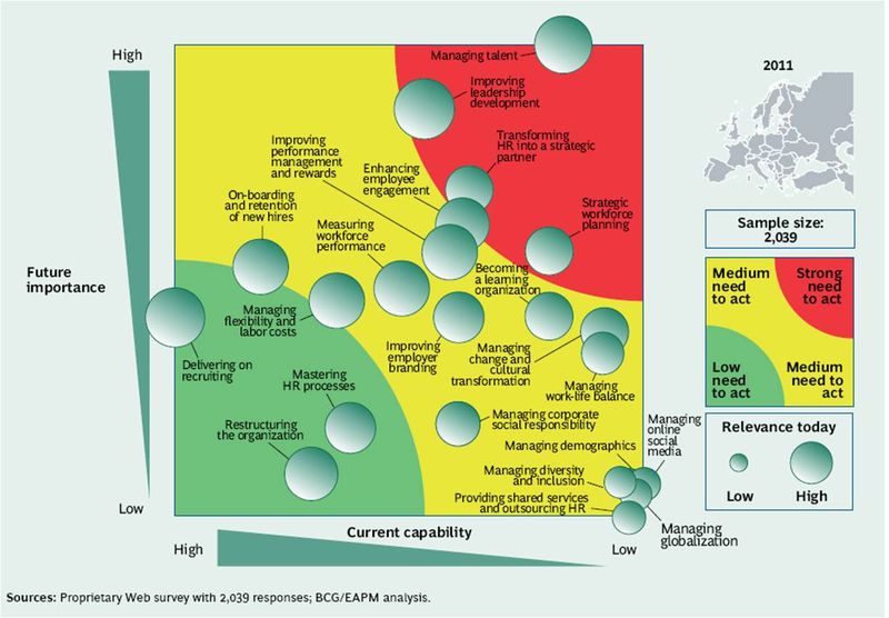 This is reflected in multiple reports, such as the “Creating People Advantage 2013” by Boston Consulting Group. It shows the strategic priorities of HR for the coming years in Europe and collects the aggregate responses of 2,300 managers of leading companies.